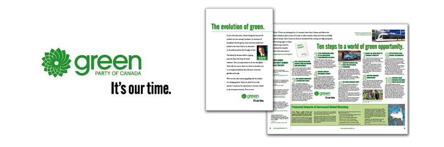 It's our time This positioning associates the green party with current environmental awareness and popularity. It is positive and optomistic. The newspaper. 'The evolution of green', highlights how the Green Party has grown and risen to the challenge of developing policies for the issues that now matter most to Canadians. Inside the paper, the 'ten steps' align Green Party national policies with economic opportunities. (Click here to read the PDF in a new window) Results: |