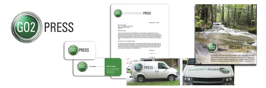 Design & Advertising The name lent itself to many uses. A folding business card became an invitation to call when opened. The word 'press' became a mainstay of advertising headlines. 'Press to...' became an easily adaptable modular communication approach, enabling the logo to integrate with headlines. Magazine ads in targeted business publications were used to communicate the environmental brand advantages of GO2 PRESS. A thorough pricing sheet was inserted into Business in Vancouver, letting customers know they could now tailor their quantities more efficiently than ever before. A boldly-labelled delivery van spread the GO2 PRESS message on the streets. |