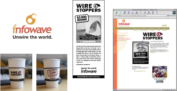 Reaching the Geeks To publicize this 'reward', our team developed Wirestoppers - and its rallying cry 'Unwire the World'. This sub-brand provided an impactful platform for Infowave's H.R. department and even described the mission of the company itself. We used a combination of entertainment print media, bathroom posters at select restaurants and bars (near high-tech hubs) and a viral friend-to-friend video posted on the Wirestoppers web sitelet. The video was shot in a single night at the Infowave offices. We even put our message right into the hands of prospects, with printed coffee sleeves distributed at key locations near Infowave competitors. |